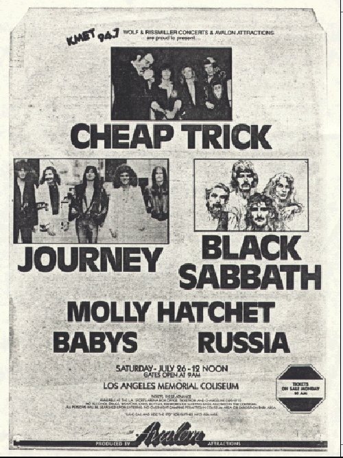 On July 26th, 1980, the Summer Blowout festival was held at the Los Angeles Memorial Coliseum. The performers included Black Sabbath, Journey, Cheap Trick, Molly Hatchet, Babys and Russia. Over 75,000 concert goers packed the Coliseum, as temperatures reached 100 degrees. Tickets sold for just over twelve dollars.