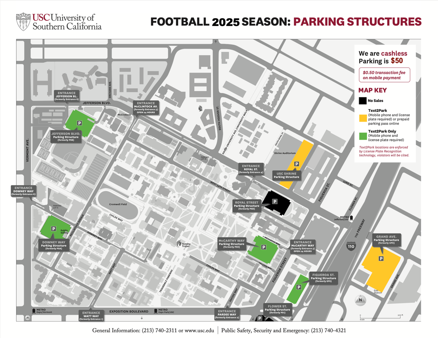Event parking this season is $50/vehicle ($0.50 transaction fee for mobile payments), and USC Campus parking is now completely cashless.