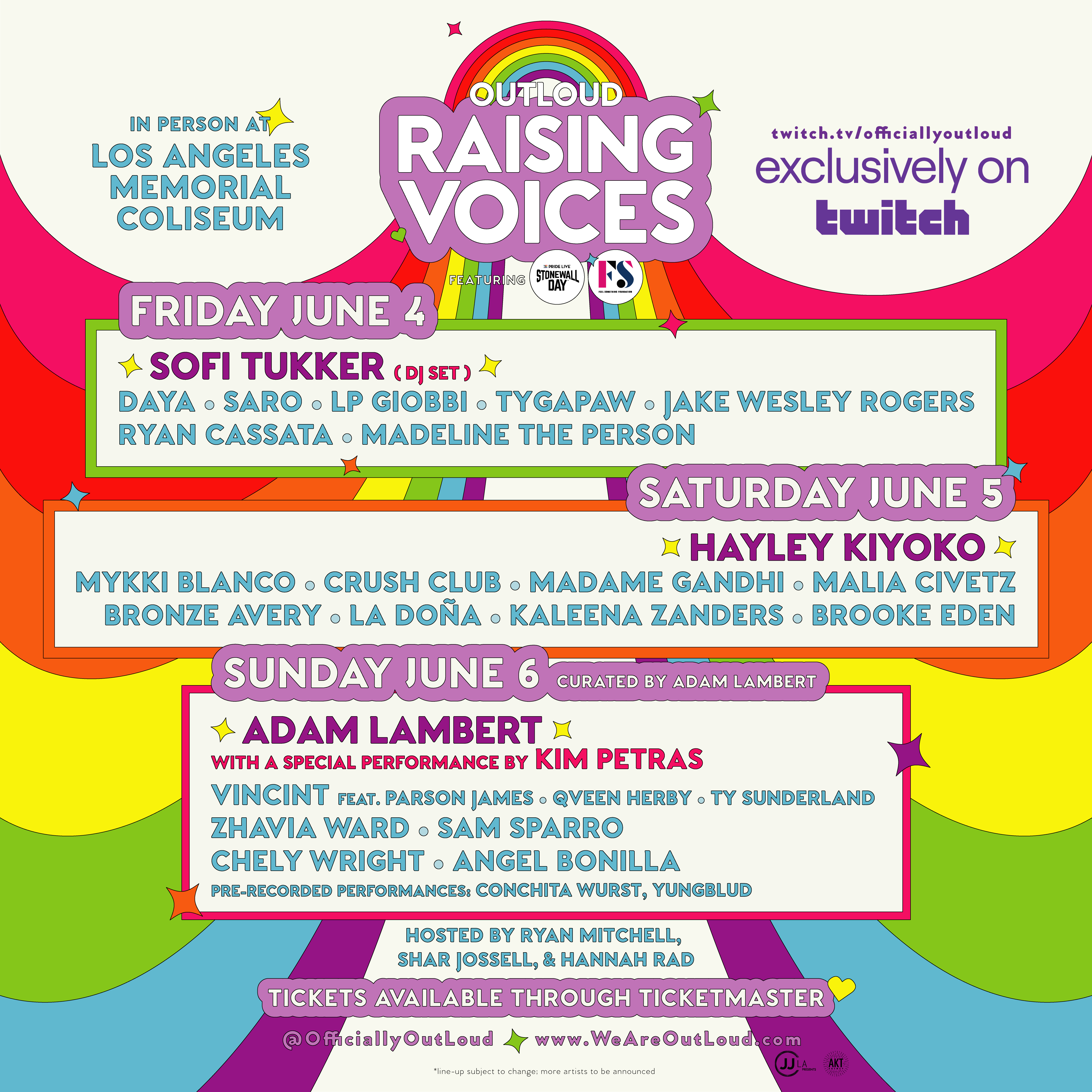 OUTLOUD: RAISING VOICES announces Pride Month kick-off concert June 4th-6th at the LA Memorial Coliseum. The event joins forces with Pride Live’s Stonewall Day, featuring a special line-up curated by Adam Lambert on behalf of the Feel Something Foundation.