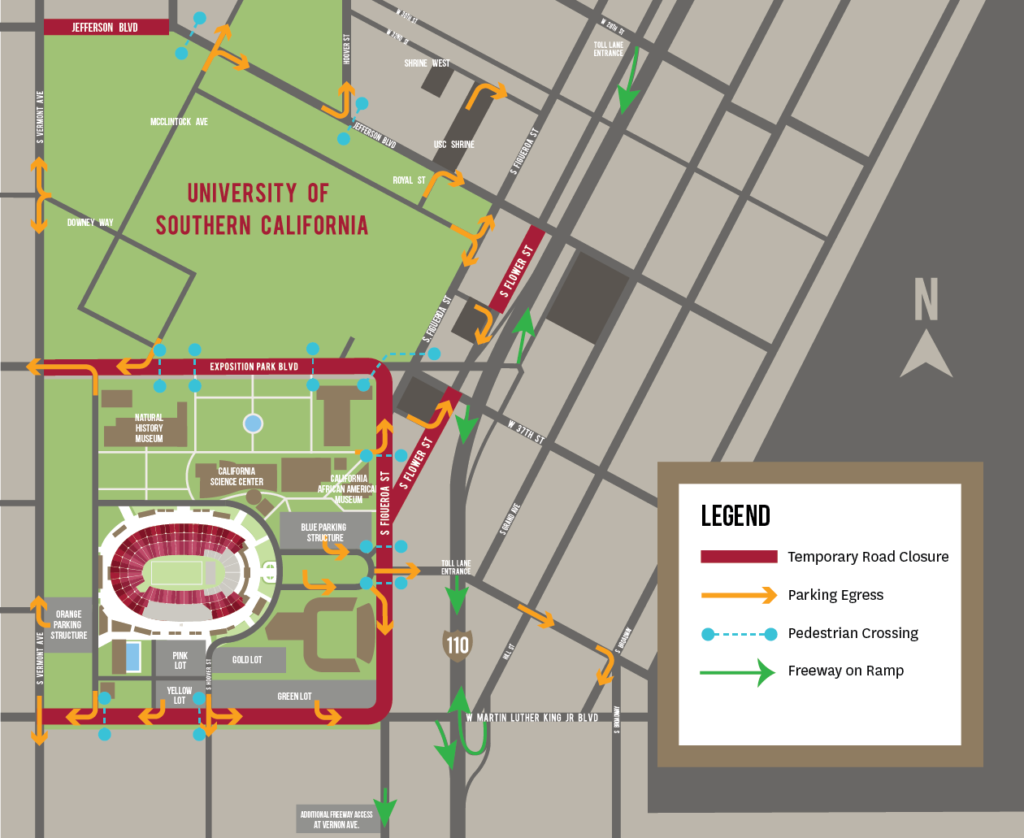 - Most traffic into Exposition Park is right-turn only. Left-turn pockets will be closed.